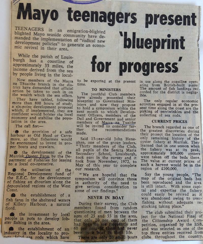 In October 73' Louisburgh Foróige creates national headlines, with their vision for Louisburgh. See Irish Times article pictured above.